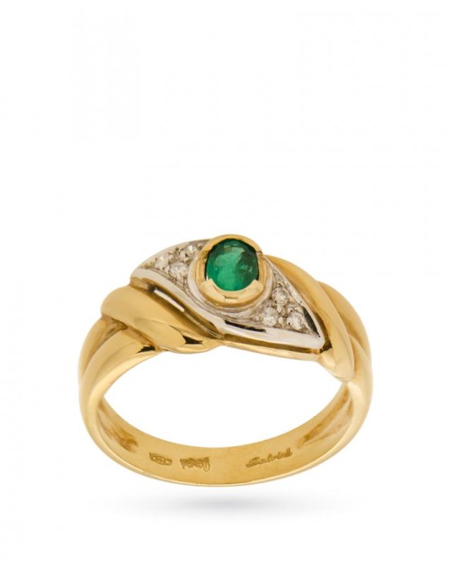 Un anello vintage dal design unico: un intreccio di oro giallo e bianco al cui apice è posto uno splendido smeraldo verde a taglio ovale. La gemma centrale è impreziosita poi da diamanti a taglio brillante posti ai lati, uno splendido connubio di preziosità ed eleganza. E' accompagnato da scatola regalo e garanzia.