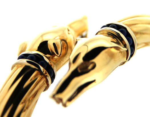 Un eccezionale bracciale rigido contrario in oro giallo 18kt lucido ritorto sinonimo della miglior arte orafa italiana. La particolarità di questo gioiello è data dal design a teste di levrieri e dai lapis che vanno ad impreziosirne ogni singolo aspetto.