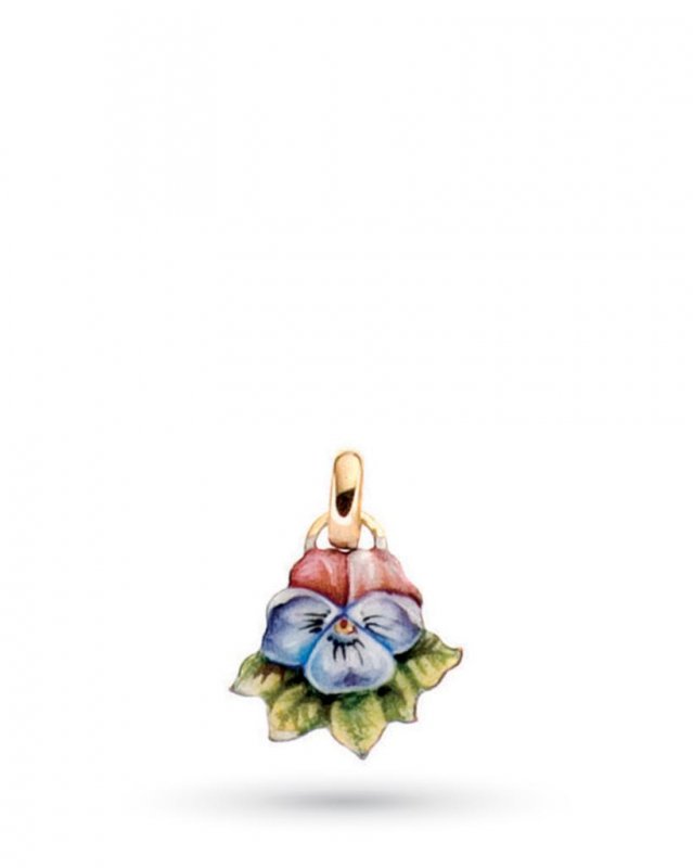 Uno splendido ciondolo Gabriella Rovalta dalla forma a violetta realizzato interamente in oro rosa 18 kt e rame. Ciò che rende questo gioiello un vero capolavoro di oreficeria è la magnifica smaltatura data a mano che ne valorizza ogni caratteristica estetica rendendo il ciondolo una vera e propria opera d'arte miniaturizzata.